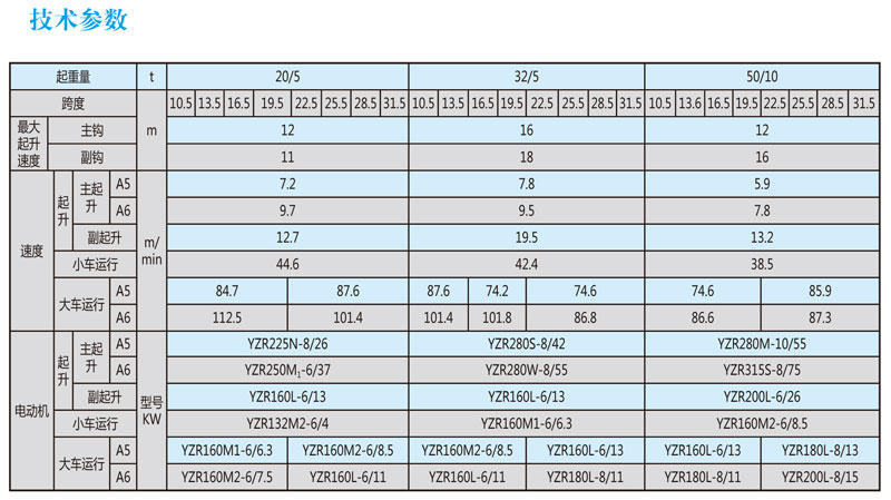 QD型吊鉤橋式起重機,主要由橋架、大車運行機構、小車、電器設備等組成。根據使用頻繁程度不同,分為A5、A6兩種工作級別。起重量為5-120T,跨度為7.5-35.5米,工作級別為A5—A6,工作環境溫度為-25℃--40℃。